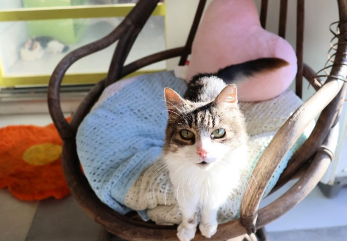 Depuis mon retour au refuge, je suis chouchoutée les salariés sont aux petits soins avec moi. Je me montre très gourmande, j’adore la pâtée, c’est délicieux. Je suis une vraie pipelette, du coup je me suis trouvée une super occupation je suis la concierge de la chatterie, j’accueille les visiteurs et je leurs réclame des gratouilles, aucun ne résiste à mon charme. Une fois ma journée terminée, je prend en otage un bénévole pour profiter d’une super sieste sur ses genoux, et ça c’est le top !